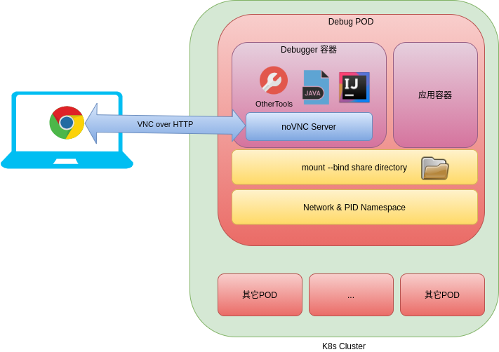 debugger 容器中启动 xvnc 和 novnc - 通过 k8s nodeport service 等方式,让开发者本机可以访问 novnc 的端口